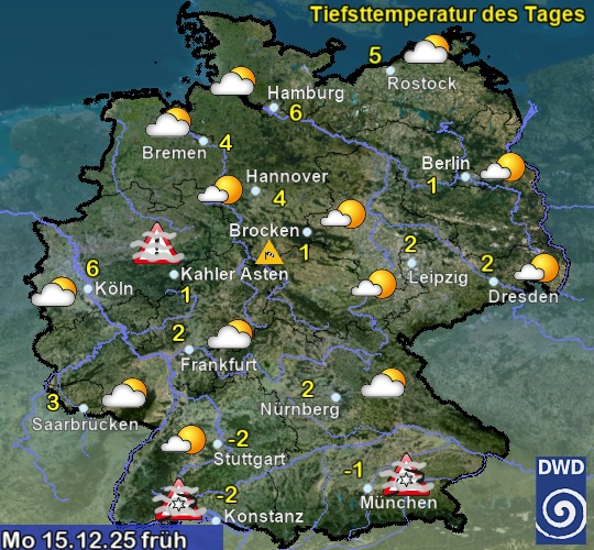 Vorhersage von Tiefsttemperatur und Wetter für Dienstag früh, 16.12.2025 ------------------------------------------------------------------- Hamburg 4 heiter Rostock 4 heiter Bremen 4 heiter Hannover 5 heiter Berlin 0 bewölkt Brocken 3 heiter Sturmböen Kahler Asten 2 heiter Leipzig 1 heiter Dresden 1 bewölkt Köln 7 bewölkt Frankfurt 1 bewölkt Saarbrücken 2 bewölkt Nürnberg -1 bewölkt Stuttgart -2 heiter München -2 bewölkt Konstanz -1 bewölkt Temperaturen in Grad Celsius